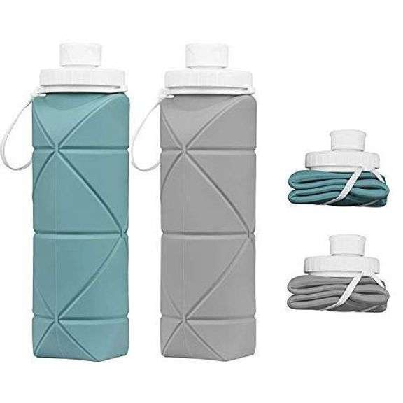 LOT 227U - Lot Of 2: Blue And Grey Silicone Collapsible Water Bottle Leak Proof 20 oz - Lightweight, For Yoga, Hiking, Sports, Workout, Etc.
