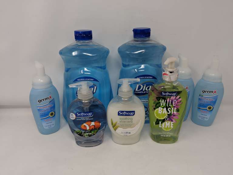 2- Dial liquid antibacterial hand soap spring water 52 fl oz. 3- Germ X Alcohol Free Foaming Hand Sanitizer 7 fl oz. 2- Soft soap 7.5 fl oz & 1 soft soap 13 fl oz