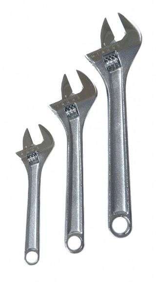 LOT 1107U - Westward Adjustable Wrench Set Of 3, Chrome, Length 6", 8", 10", Jaw Capacity 3/4", 1", 1 1/8", #1NYB8G