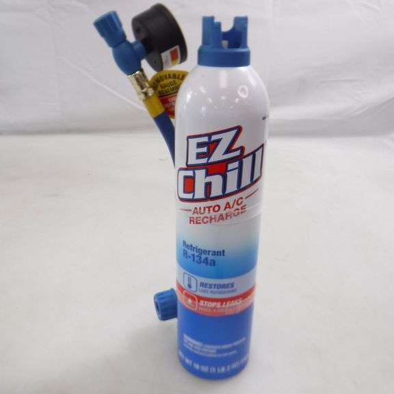 LOT 864U - (Top Of Bottle Is Broken!!) Interdynamics MAC-134 R134a EZ Chill Refrigerant Refill With Charging Hose And Gauge, 18 Oz