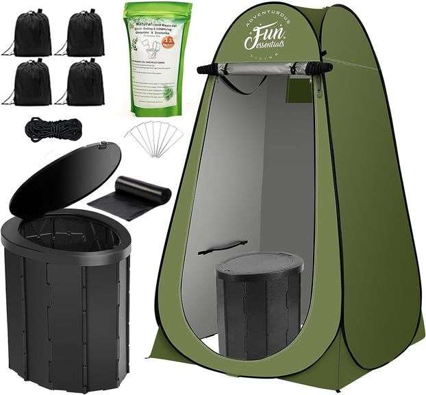 Pop-up privacy tent 47.2"x47.2"x74.8" Portable folding toilet 14.9"x12.2"x15.4" Toilet bag 12-Pack Liquid waste gel 2-Pack