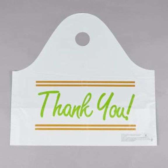 LOT 2574 - 19 X 9 1/2 X 18 White Plastic Take Out Bag with Printed Thank You Design - 500/B