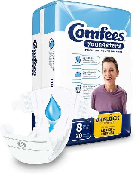 LOT 1053T - Lot of 4 Comfees Youngsters Premium Youth Diapers – Size: 8 20-Diapers/Pack