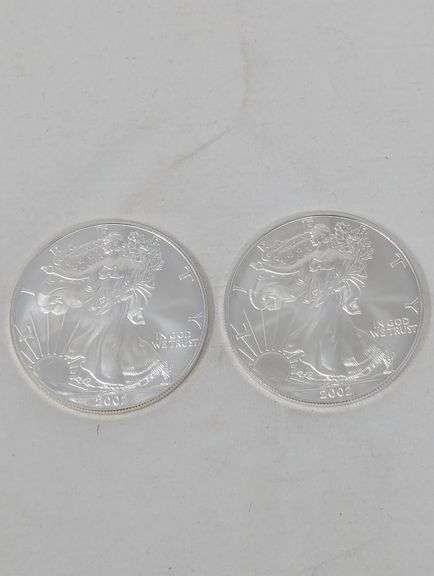This lot includes two (2) American Silver Eagles from 2002: each struck in .999 fine silver and weighing 1 troy ounce. These are genuine U.S. Mint bullion coins featuring the iconic Walking Liberty design on the obverse and the heraldic eagle reverse.