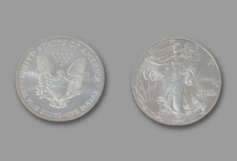 This lot includes two (2) American Silver Eagles from 2002: each struck in .999 fine silver and weighing 1 troy ounce. These are genuine U.S. Mint bullion coins featuring the iconic Walking Liberty design on the obverse and the heraldic eagle reverse.